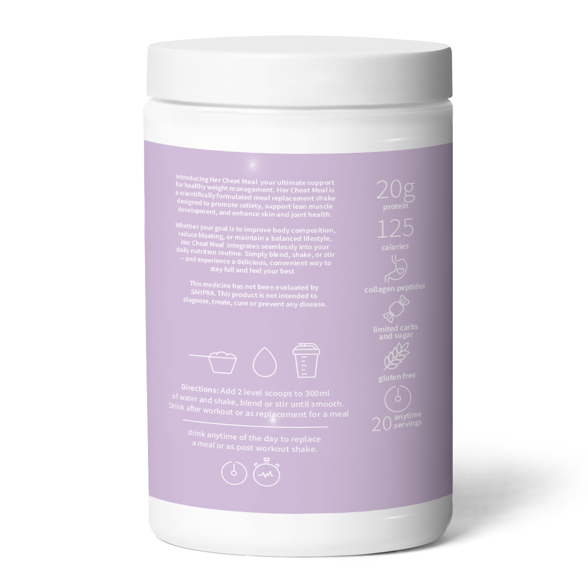 Introducing Her Cheat Meal your ultimate support for healthy weight management. Her Cheat Meal is a scientifically formulated meal replacement shake designed to promote satiety, support lean muscle development, and enhance skin and joint health.